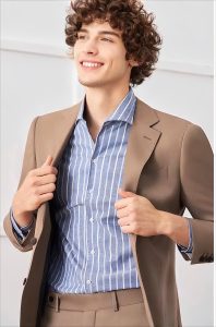 Một bộ vest đẹp trước hết phải lên dáng đúng. Với người có thân hình cân đối, phom Slim Fit hoặc Tailored Fit thường mang lại cảm giác hiện đại và gọn gàng. Với người cần sự thoải mái hơn trong cử động, Regular Fit là lựa chọn hợp lý hơn. Những chi tiết như vai áo, độ ôm ngực, tay áo và chiều dài thân áo đều cần được kiểm tra kỹ khi thử. Nếu vai áo quá rộng, bộ vest sẽ mất sự chỉn chu. Nếu quá chật ở ngực và eo, tổng thể sẽ trở nên nặng nề, thiếu thoải mái.